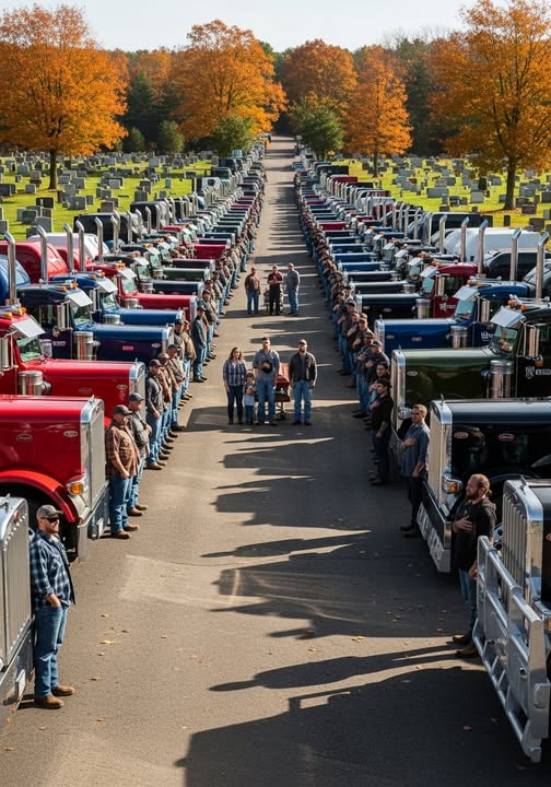 Instead, I found forty-seven eighteen-wheelers lined up along the cemetery road in perfect formation, their chrome bumpers and polished fuel tanks gleaming like a military parade. The engines were silent, but the presence of so many massive vehicles spoke louder than any eulogy could have managed.