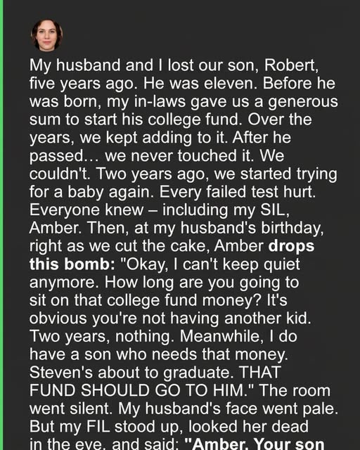 At a recent family gathering for my husband’s birthday, his sister, Amber, brought up the fund. Her words were direct — she suggested we give the money to her teenage son instead. The room fell silent. Before I could respond, my father-in-law spoke firmly, reminding her that both grandsons had been given equal funds and that her own had long been spent. His calm but steady words carried the weight of fairness and truth, leaving no room for argument.Still, something in me stirred. I stood and told her, gently but clearly, that the fund would remain untouched. “It belongs to Robert,” I said. “It carries his memory, his dreams, and our love.” The money itself wasn’t the issue — it was what it represented. Every deposit had been made with care, every dollar a reminder of a life that mattered deeply. To give it away would mean losing another part of him, and I wasn’t ready to do that.