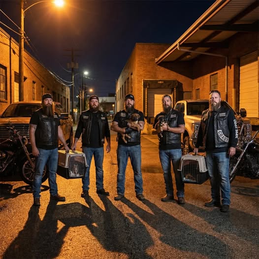 The title had already framed the moment in my mind, but nothing prepared me for how quickly fear and confusion gave way to something entirely different. From my apartment window, the scene looked suspicious in every way. The hour was wrong. The silence was wrong. Six bikers in heavy leather vests moving in and out of the local dog shelter at 3 AM felt like the beginning of a terrible story I didn’t want to witness. My instincts told me to act fast, to protect the animals, to call for help before it was too late. Yet the longer I watched, the harder it became to match their actions with the danger I imagined. There was no rush, no aggression—only patience, care, and an almost reverent calm.As I got closer, details sharpened. These men were not taking anything that could be sold or stripped for parts. They weren’t breaking doors or forcing cages. They were lifting dogs gently, speaking in low voices, wrapping nervous paws in blankets. One man paused for nearly a full minute just to calm a frightened dog before moving again. When I finally shouted at them, my voice shaking with anger and fear, the tension broke like glass. They froze, not defensive, not threatening—just surprised. And when the police car arrived moments later, flashing lights cutting through the darkness, the bikers didn’t run away. They stepped back, hands visible, letting events unfold.What followed was not an arrest, but an explanation. Earlier that night, a nearby warehouse fire had released toxic smoke into the area. The shelter, old and poorly ventilated, was directly in its path. Emergency services were overwhelmed handling evacuations, and the shelter manager—desperate and out of options—had reached out to a volunteer network that included a local motorcycle group known for animal transport during disasters. These men weren’t criminals. They were the only ones who could move fast enough, carry enough crates, and navigate blocked streets before the smoke reached the animals. The police officer confirmed it quietly, almost apologetically, before helping guide traffic as the last truck pulled away.