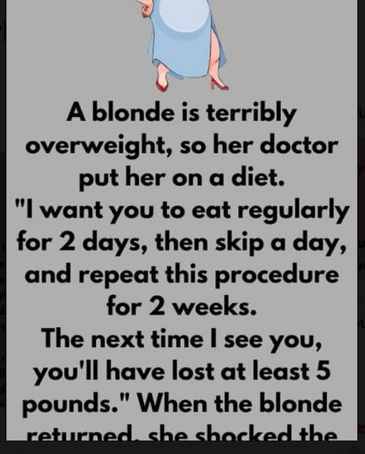 A blonde is terribly overweight, so her doctor put her on a diet. “I want you to eat regularly for 2 days, then skip a day, and repeat this procedure for 2 weeks. The next time I see you, you’ll have lost at least 5 pounds.”