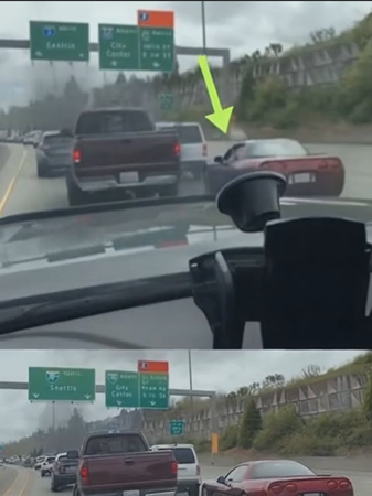 The Corvette driver’s face, partially obscured by sunglasses, reflected a sense of irritation and defiance, as though daring the truck to test his patience further. At this point, the scene had drawn the attention of other drivers, who slowed just enough to watch the unfolding standoff.