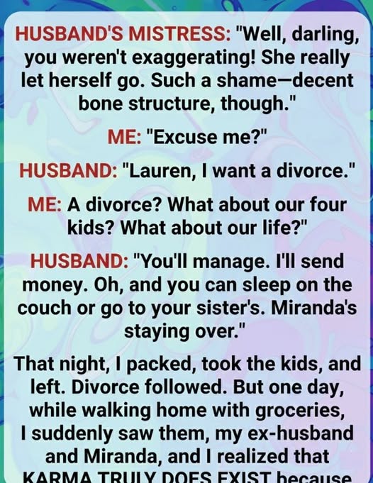 “Divorce? What am I supposed to do with four kids and a mortgage?” I asked, stunned. “You’ll figure it out,” he replied casually. “I’ll send money. You can take the couch or go stay with your sister. Miranda’s moving in tonight.” The sentence cut through me with a finality I hadn’t expected. That evening, I packed essentials, gathered the children, and walked away from the house I had poured years of work, compromise, and heart into.The legal process that followed was draining, but it also forced me to confront truths I had ignored for too long. The disrespect I had tolerated had slowly drained my spirit, and leaving, though painful, was the first step toward reclaiming myself. The beginning was rough. I juggled jobs, school pickups, bills, and sleepless nights, often wondering how much longer I could hold everything together. But gradually, life softened.I started waking up early just to breathe before the chaos began. I read books again, made healthier choices, cleared clutter, and created routines that nurtured us instead of exhausting us. Friends returned, new connections formed, and laughter slowly filled the space that had once been tense and unpredictable. The kids blossomed in a home built on honesty, not hostility. Months later, carrying groceries with my mind elsewhere, I spotted my ex and Miranda across the street. The confident couple that once shattered my life looked frayed. He was fumbling with bags; she was snapping at him without restraint.They didn’t see me, but I saw the truth: the chaos I escaped had simply recycled itself. I didn’t feel smug or angry—just quietly affirmed. Life doesn’t always deliver justice with fireworks. Sometimes, it reveals the consequences in ordinary daylight. As I walked home, my kids laughing beside me, I realized I hadn’t just survived—I had rebuilt. What was meant to break me instead became the foundation for a life rooted in peace.