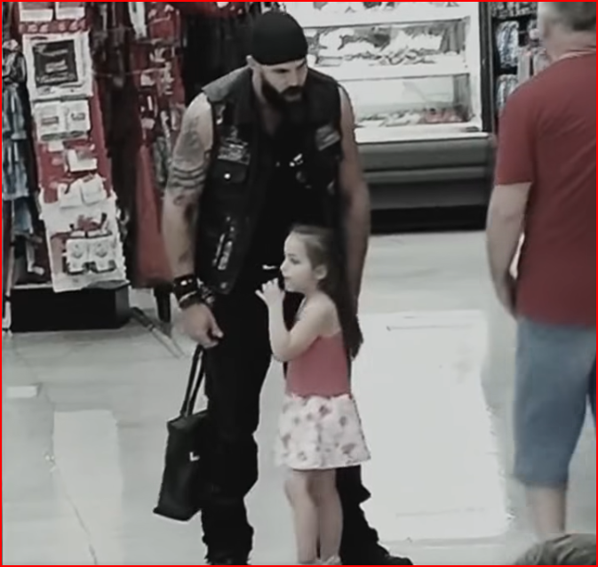 It was an ordinary afternoon at a Walmart when something extraordinary happened. A small, mute six-year-old girl suddenly broke away from the crowd and ran straight into the arms of a massive, tattooed biker. Shoppers froze, unsure whether to be scared or concerned, as the little girl clung tightly to the stranger’s leather vest, tears streaming down her face.