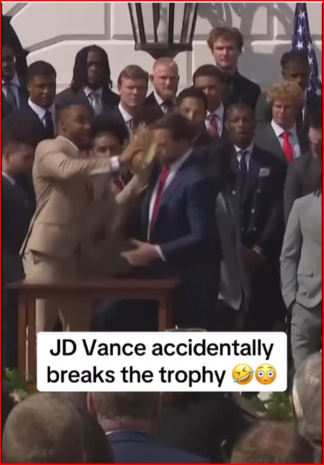As it turns out, Usha’s unconventional footwear wasn’t the most awkward moment of the day. That title went to the CFP National Championship Trophy itself, which dramatically broke apart while being handed to JD Vance. The base of the trophy dropped to the floor, creating a split-second of chaos.
