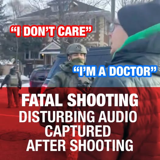 In the recording, a man identifies himself as a physician and offers to provide medical assistance to a woman who had been shot. The audio captures a brief but forceful response from an agent as the area remains secured.