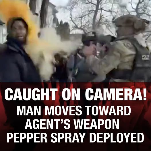 At a critical point, the agent deploys pepper spray at close range, immediately stopping the individual’s advance. The use of force appears brief and targeted.